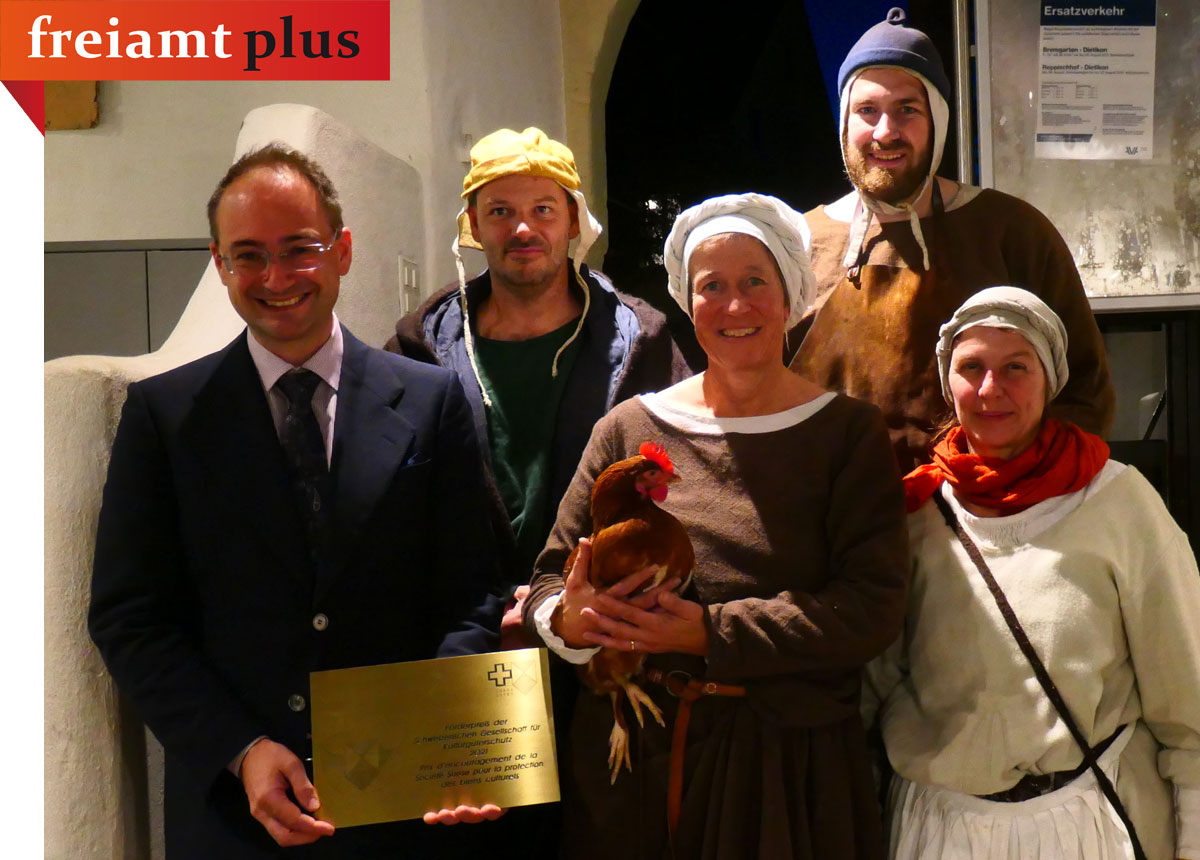 «Historische Bauten haben es schwer, dass sie erhalten bleiben und so zur Wahrung der Geschichte unseres Landes beitragen können», meinte Dr. Heinrich Speich, Vize-Präsident der Schweizerischen Gesellschaft für Kulturgüterschutz (SGKGS) anlässlich der Preisübergabe im Trottenkeller, Bremgarten. Die SGKGS wolle dem Gegensteuer bieten und entsprechende Aktivitäten zugunsten des Schutzes des Kulturerbes unterstützen. So überreiche man mit grossem Dank und in Anerkennung für die geleisteten Arbeit den KGS-Förderpreis 2021 in der Höhe von 4000 Franken dem Verein «abenteuer-zeitreise». Die Mitglieder des Vereins haben mit grossem Engagement und viel Zeitaufwand ein mittelalterliches Haus aus dem Jahre 1480 vor der endgültigen Zerstörung gerettet. Die Initiantin des Vereins, Silvia Aeschimann, bedankte sich im Namen des ganzen Teams und meinte: «Es ist eine willkommene Unterstützung, vor allem aber eine grosse Motivation weiterhin dran zu bleiben.»