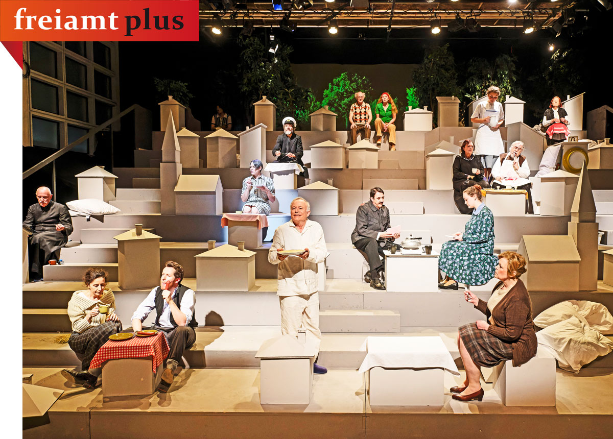 Die dreissig kleinen Häuschen, jedes für sich, mit ihren kleinen Geheimnissen unter dem Dach widergeben ein Dörfchen, wie es sein könnte. Die Bewohner:innen ruhen sich auf ihren Kissen aus und das Erzählerduo Gritli (Astrid Döbeli) und Gregor (Paul Steinmann) lässt das Dorf untermalt von Musik (Christov Rolla) erzählend erwachen und bringt die Bewohner:innen des schlafenden Dorfes zu herrlichen Dialogen bis in den Abend hinein. Dabei dreht sich alles um die nachbarschaftlichen Freundlichkeiten, wer denn jetzt mit wem und warum, üblichen Streitigkeiten und Ansichten mit dem Anspruch Recht zu haben – wie es sich eben in einem Dorf, wo jeder jeden kennt, so lebt. Regisseur Dodó Deér stellt in seiner Inszenierung die einzelnen Bewohner:innen ins rechte Licht und lässt ihnen im von ihm gestalteten Bühnenbild freien Spielraum. Die Spielleute verstehen es gekonnt den Figuren in Mimik und Wort die zutreffenden Charakteren zu geben.