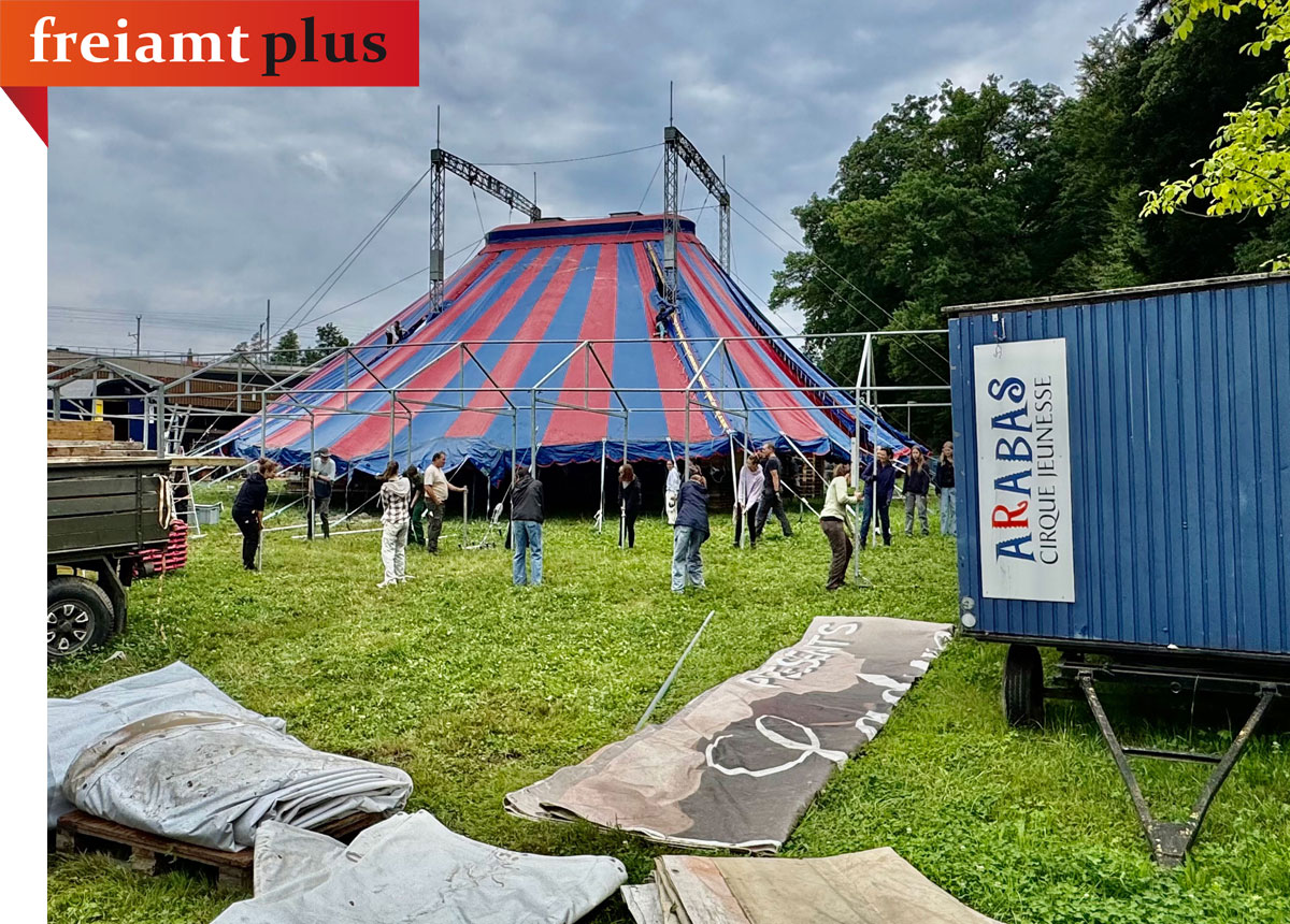Die Vorbereitungen für die Aufführung des Programms 2025 finden nun langsam ihren Abschluss – das Zelt mit Manege und Publikumsplätze entsteht, Küche und Buffet werden bereit sein. Das sind ein Teil der Rahmenbedingungen, damit eine Zirkusaufführung möglich ist, aber im Vordergrund steht der «Inhalt». Das wäre unter anderem die Programmidee, die Choreografie der einzelnen Nummern, die Kostüme und Gestaltung der Manege, vor allem aber die vierzig jungen Artist:innen, die während mehreren Monaten unter fachkundiger Leitung üben und trainieren und ihren Auftritt in der Manege bestens vorbereiten. Die rund 60 Helfer:innen lassen dafür in einem intensiven Arbeitsprozess eine kleine Zirkusstadt entstehen.