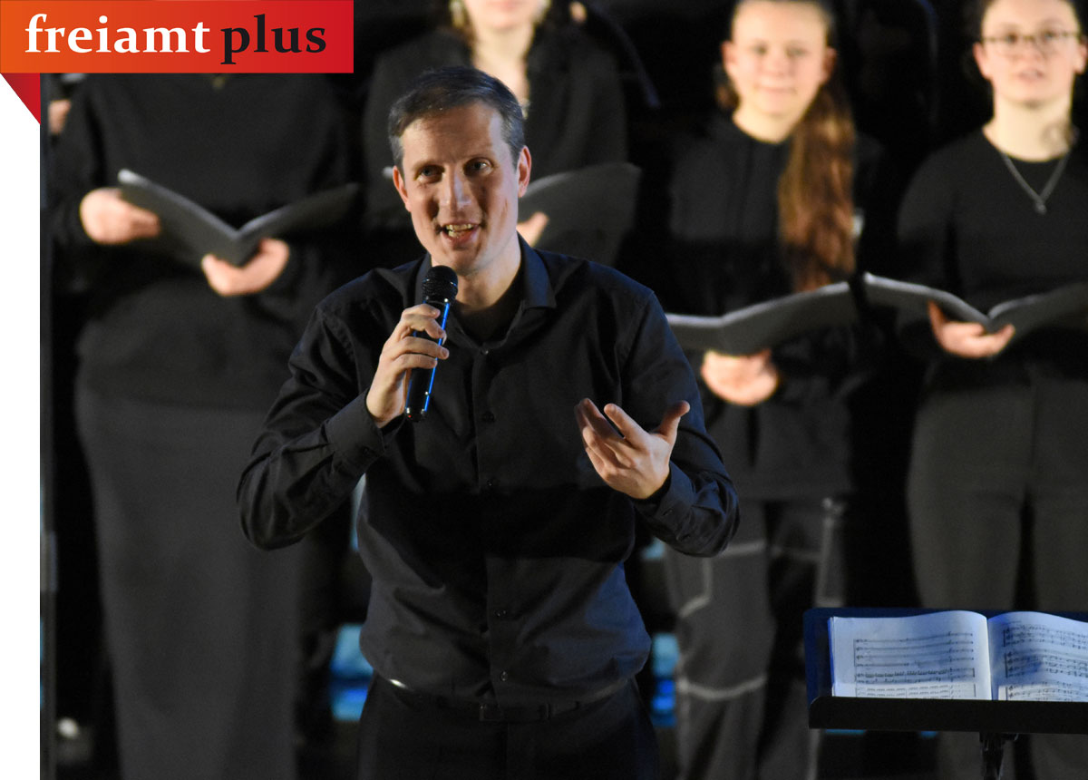 Mit dem Werk «Oj Triglav moj dom» von Jakob Aljaž (1845 bis 1927) treffen sich dann die 200 Sänger:innen der beiden Chöre auf der Bühne. Sie sind nicht einfach in zwei Chöre (links und rechts) aufgeteilt, sondern mischen sich in kleinen Gruppen untereinander und lassen so aus zwei Chören einen entstehen. Im (fast) zeitgenössichen Stück «Immortal Bach» in einer Bearbeitung von Knut Nysted (1915 bis 2014) der ersten Zeile des Chorals «Komm, süsser Tod» von Johann Sebastian Bach (1685 bis 1750) wird sich der Chor in vier Gruppen aufteilen und in einem unterschiedlichen Tempo einen disonanten Klang entstehen lassen, sich aber trotz unterschiedlicher Geschwindigkeit im Schlussakkord im friedlichen Einklang zu finden und gemeinsam eine besondere musikalische Stimmung zum Ausdruck bringen. Musikalisch habe man sich gefunden, meinte Walter Siegel, aber auch sprachlich, denn die beiden Chöre werden gemeinsam zum Lied «Wenn eine tannigi Hose hät» anstimmen.