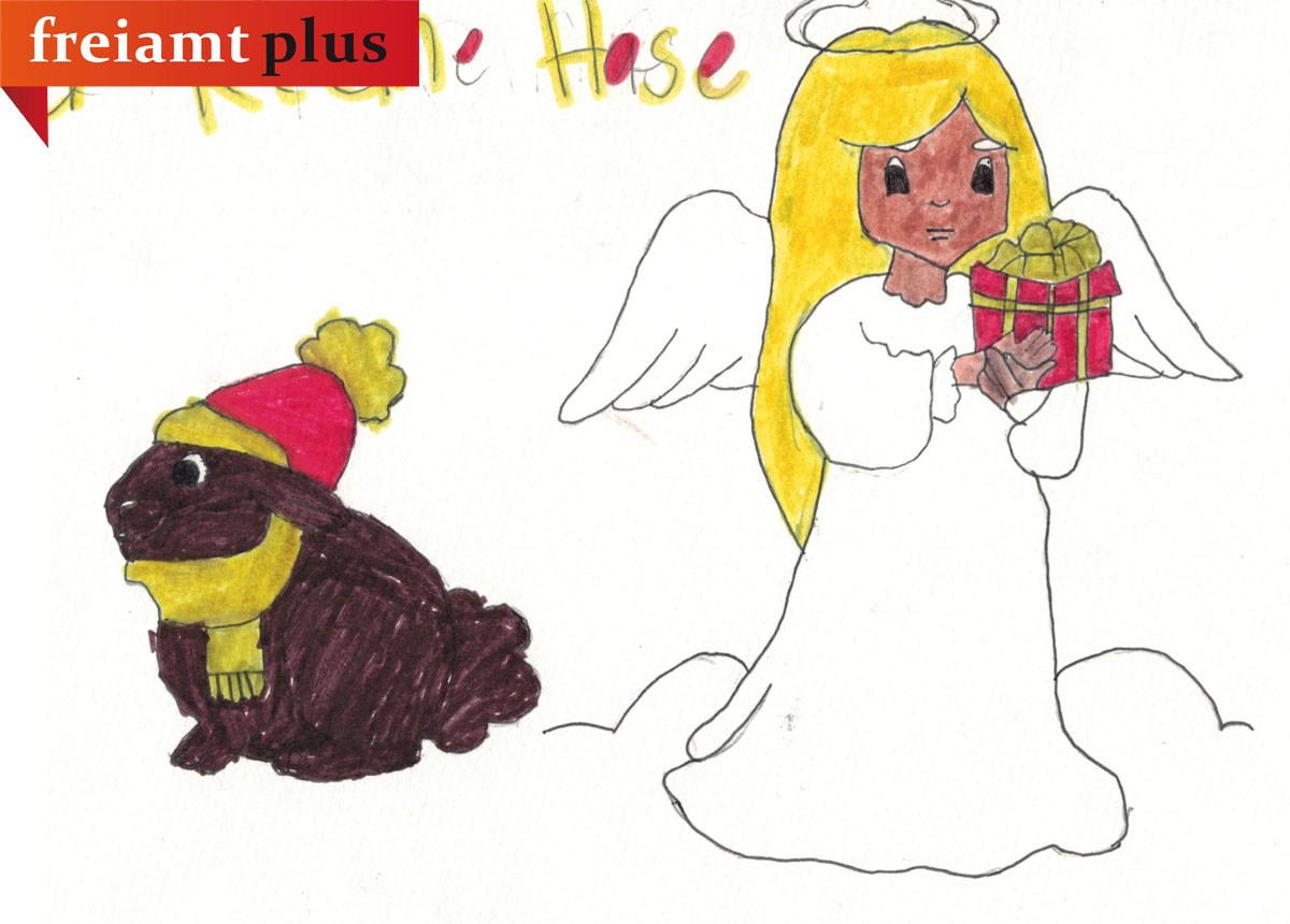 Eines Tages war ein Hase zu Hause. Der Hase sagte: Ich muss die Geschenke abholen, es ist schon spät. Das Christkind ist bestimmt schon fertig mit einpacken. Jetzt gehe ich zum Christkind, sagte der kleine Hase. Auf dem Weg traf er eine Katze und fragte, wo das Christkind wohnt. Die Katze sagte: Wenn du links gehst kommst du zum Christkind. Ich gehe links, danke vielmal. Der Hase kam nach einer Weile zu einem kleinen Holzhäuschen. Im Häuschen war das Christkind parat mit den Geschenken. Das Christkind sagte: Du kannst die Geschenke ausliefern. Gut, sagte der Hase. Er brachte die Geschenke den Menschen und die feierten glücklich Weihnachten.