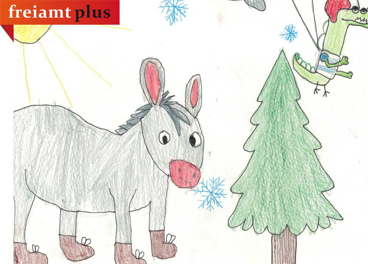 An einem sonnigen beschneiten Tag stampfte Elo der Esel mit seinen braunen Wanderschuhen durch den Wald. Elo ist ein grauer Esel. Er zieht seine Wanderschuhe nie aus, weil er sie so sehr mag. Alles war weiß, plötzlich hüpfte er auf und ab. Es war der 11. Advent und er hatte noch keinen Weihnachtsbaum. Er ging zu einer Tanne und kickte rein. Es kam eine Ladung Schnee runter. Er kickte noch fester gegen den Stamm und der Baum fiel um. Aber plötzlich hörte Elo etwas Jammern: «Aua aua mein Rücken», sagte das Krokodil Kroki. «Warum bist du auf dem Baum?», fragt Elo. Kroki sagte: «Ich war Fallschirm springen und bin im Baum gelandet.» «Ist alles in Ordnung»? fragte Elo. Kroki sagte: «Ja!‘» und raste um Elo herum. Im Nu hat er einen Wagen gebaut. Elo zog den Wagen und Kroki sass auf dem Baum. Nun haben beide zusammen einen Tannenbaum für Weinachten und so feierten beide eine schöne Weinachten.