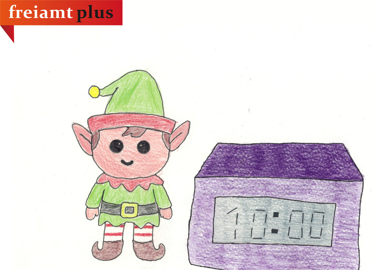 Der Wichtel Fredy wohnt bei der Familie Wild zuhause. Er liebt es Streiche zu spielen und dabei den Kindern Freude zu machen. In der Nacht auf den ersten Dezember bereitet der Wichtel gerade den ersten Streich vor. Er schleicht in die Zimmer und verstellt die Wecker der Familie von 06:00 Uhr auf 10:00 Uhr. Als am nächsten Morgen dann die Familie aufwacht, machen sie sich ganz gemütlich bereit. Als die ältere von den Schwestern auf die Küchenuhr sieht und bemerkt, dass es ja schon nach 10:00 Uhr war. Sie fragten sich wie das passieren konnte und machten sich schnell bereit. Doch als sie die Haustüre öffnen, bemerken sie, dass es draussen richtig fest regnete. Sie zogen ihre Turnschuhe aus und die Gummistiefel an und machten sich schnell auf den Weg zur Schule. In der Schule angekommen, fragte der Lehrer sie, wo sie waren. Sie erklärten, dass der Wecker zu spät klingelte und setzten sich auf den Platz.